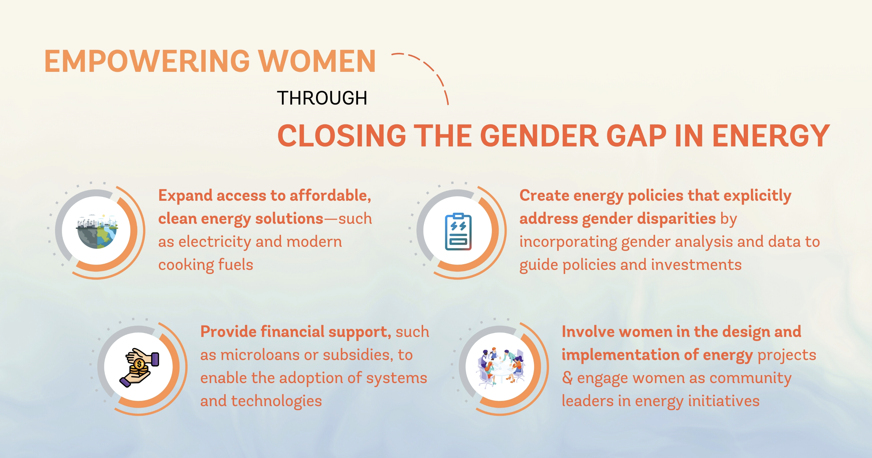 The Energy Sector Management Assistance Program (ESMAP) also focuses on gender-responsive energy solutions, recognizing that efforts need to be scaled up in decision-making, economic participation, domestic violence prevention, and female participation in the labor force to successfully achieve gender equality and empowerment. ESMAP’s initiatives to close the gender gap in energy illustrate the importance of women’s participation in renewable energy projects and modern energy access.
