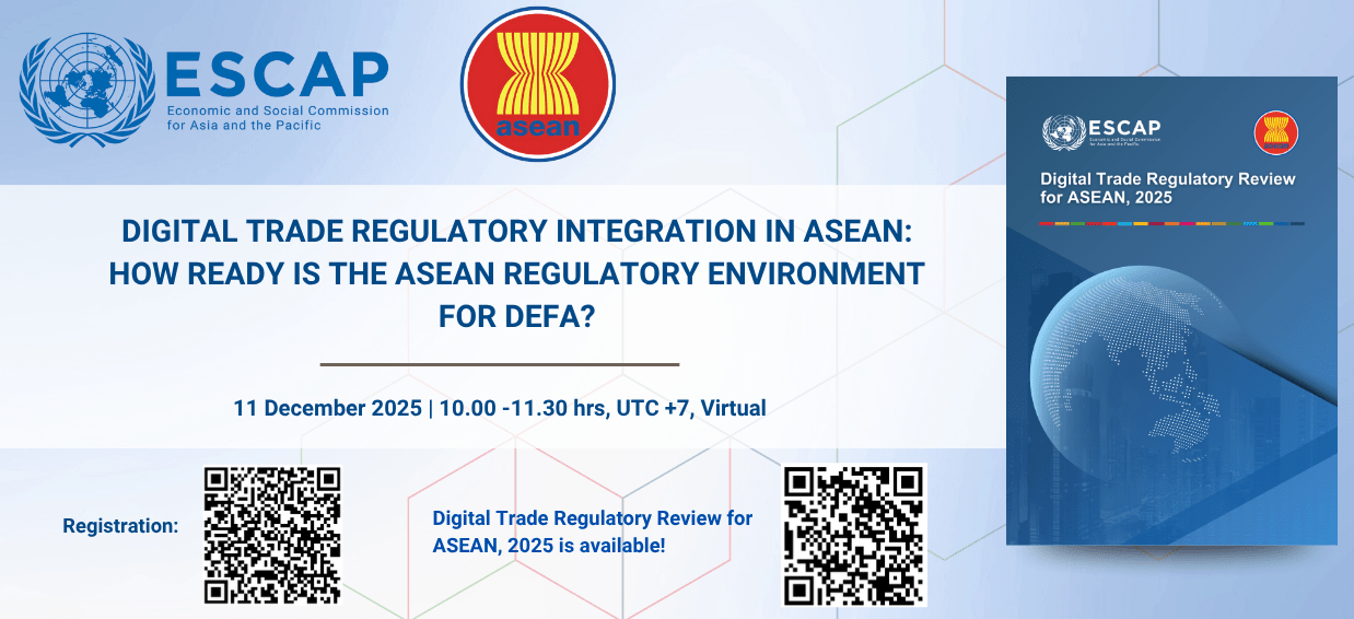 This online session will officially launch this ESCAP-ASEC report, which will serve as the basis for an expert panel discussion on how targeted regulatory alignment can accelerate digital trade, enhance regional value chain resilience, and promote inclusive economic growth across Southeast Asia. The session will also highlight subregional best practices and identify key opportunities for further digital integration within ASEAN.