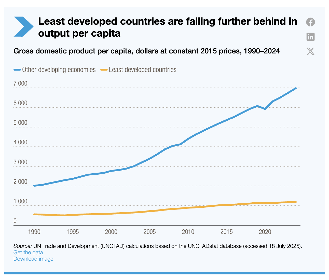 Toutefois, cette croissance reste concentrée dans des activités à faible productivité qui soutiennent les moyens de subsistance sans générer une prospérité à grande échelle. Malgré le rôle croissant des services, la croissance moyenne du revenu par habitant dans les pays les moins avancés est restée faible en 2024.