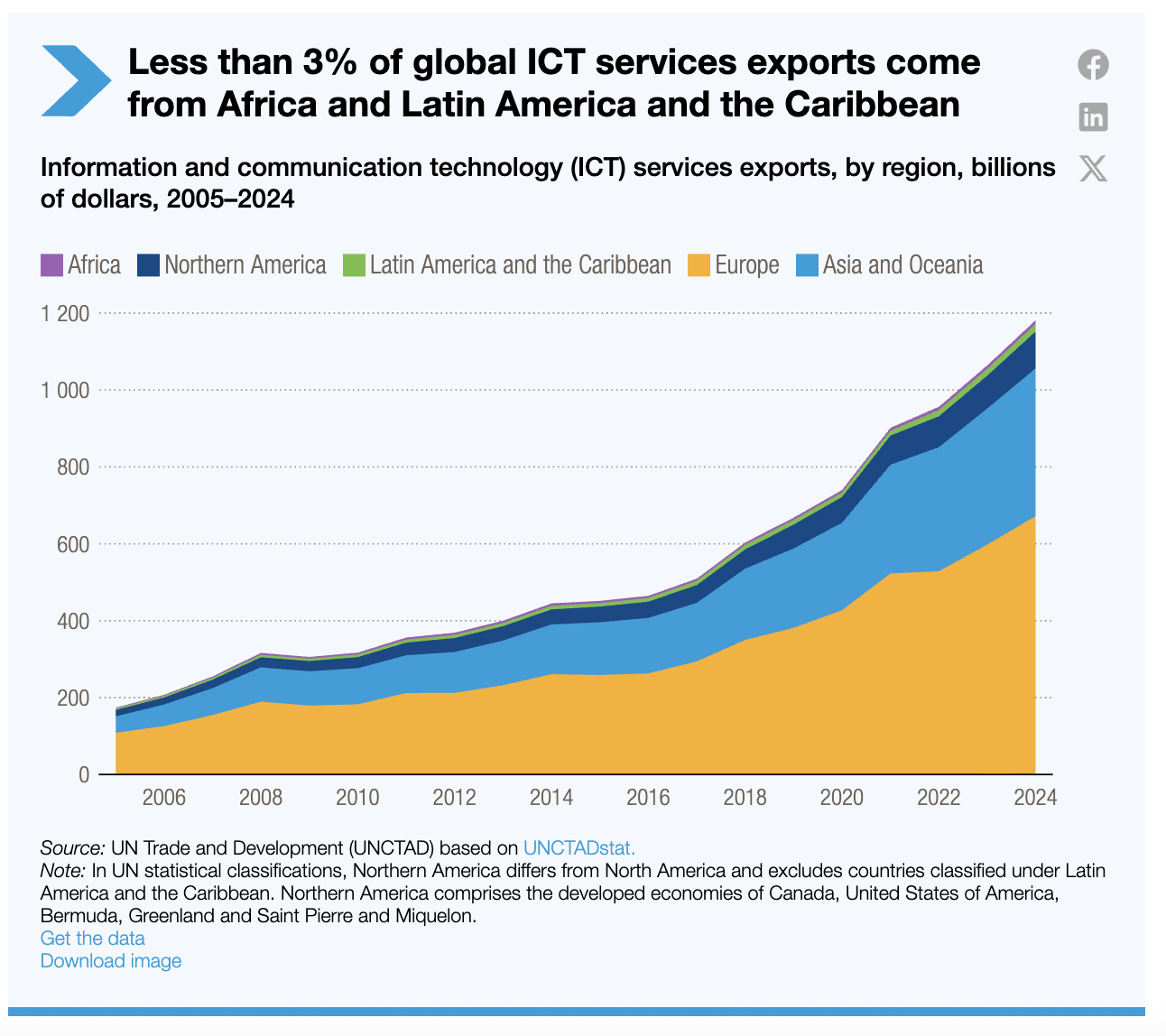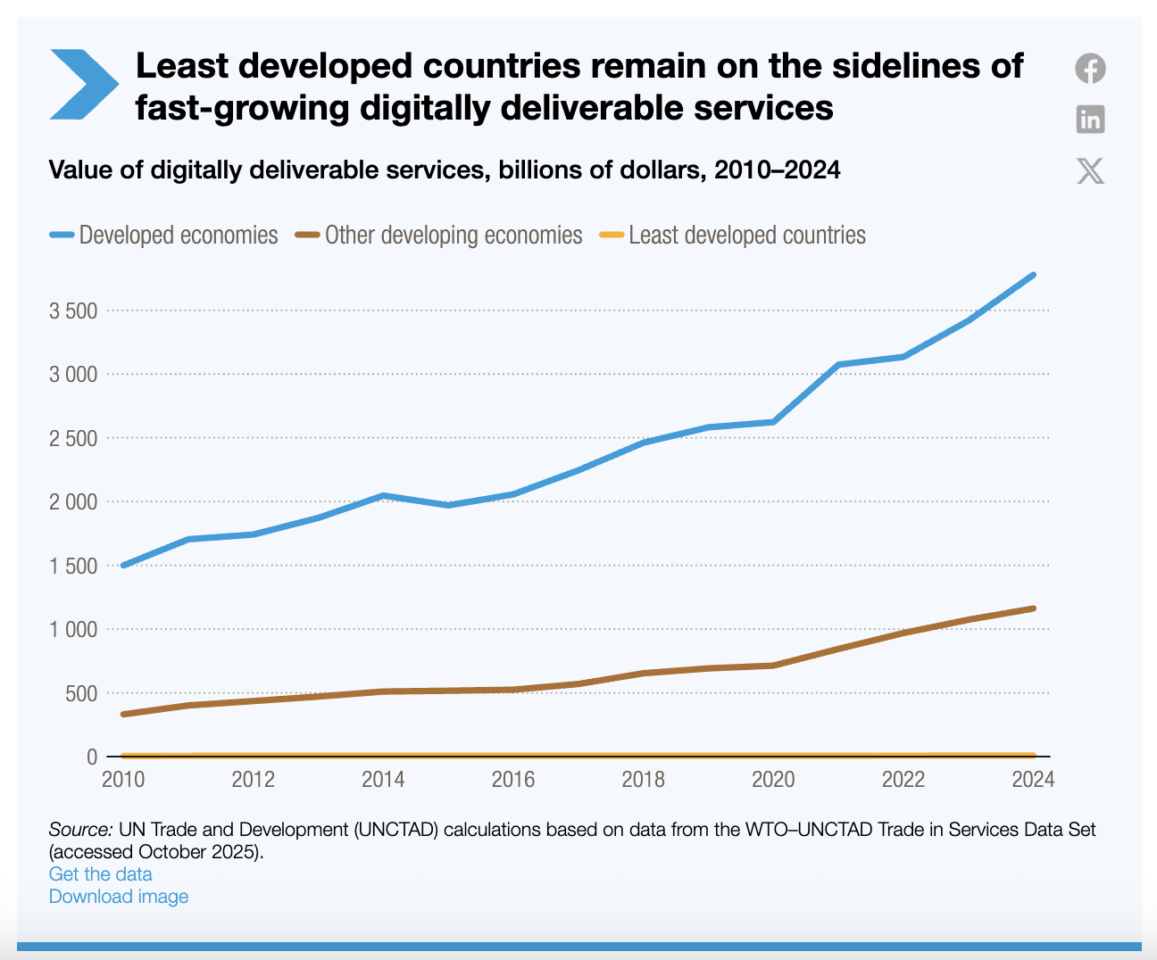 À l’inverse, les services livrables par voie numérique figurent parmi les segments les plus dynamiques du commerce mondial. Pourtant, les pays les moins avancés ne représentent que 0,16 % des exportations mondiales de ces services – leur part la plus faible depuis le début des statistiques.