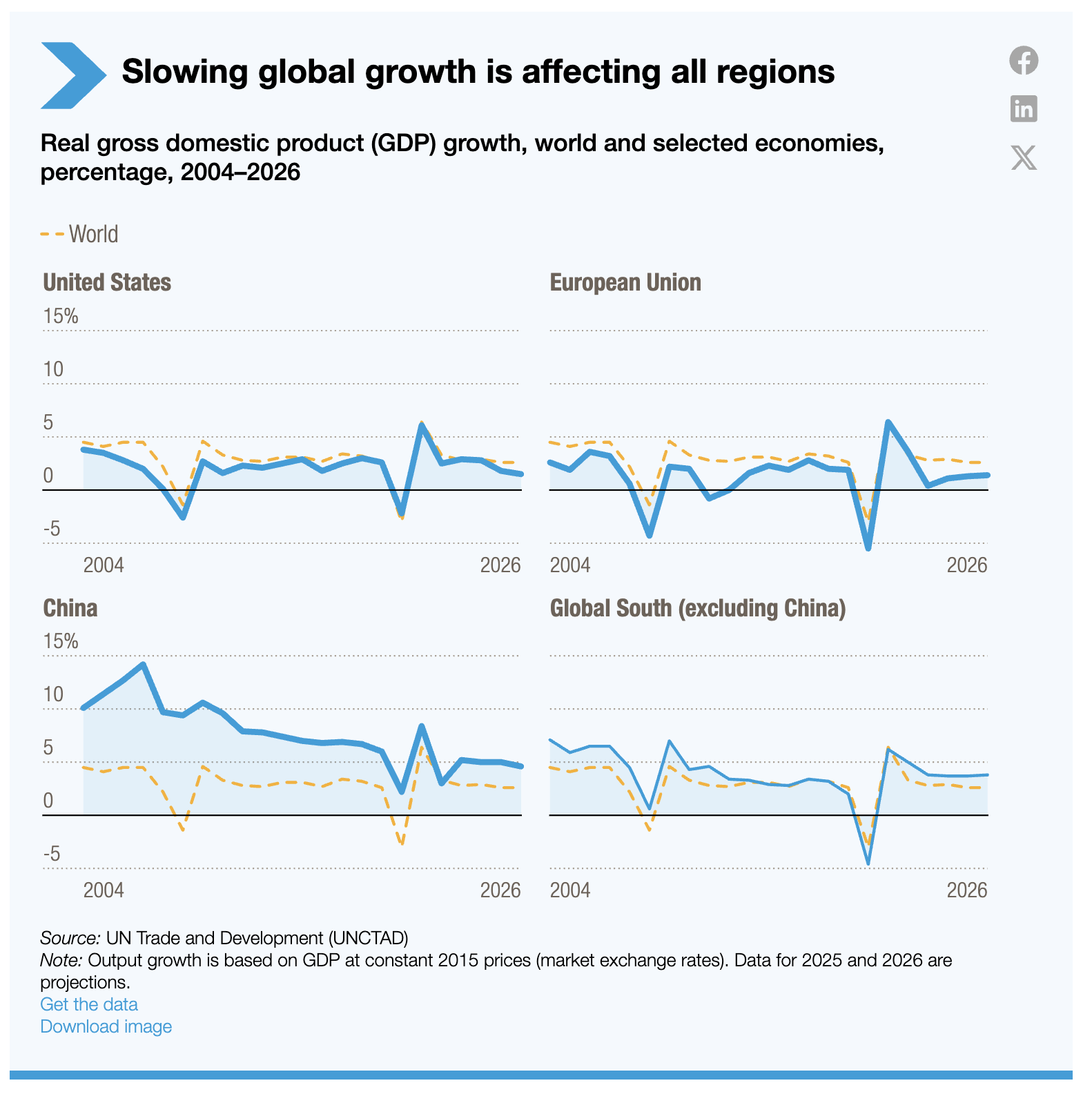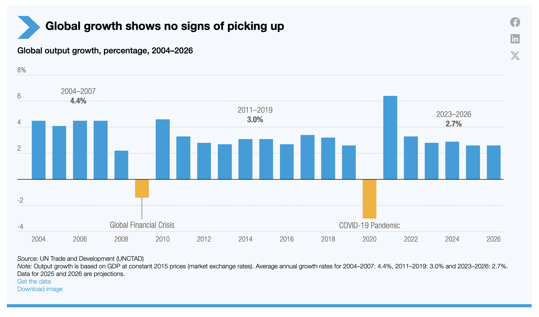 UN Trade and Development (UNCTAD) projects the world economy will expand by only 2.6% in 2025 and 2026, down from 2.9% in 2024.
