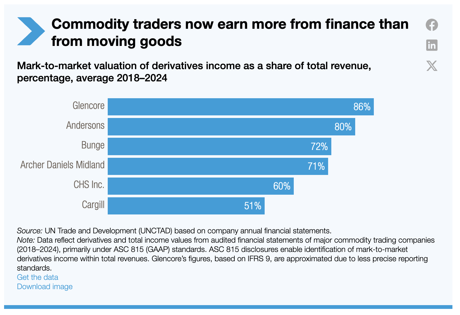 The report also highlights the growing importance of financial factors in commodity markets, especially food systems. For several major food trading companies, more than 75% of income now comes from financial operations, not from moving wheat, coffee, cocoa or other crops.
