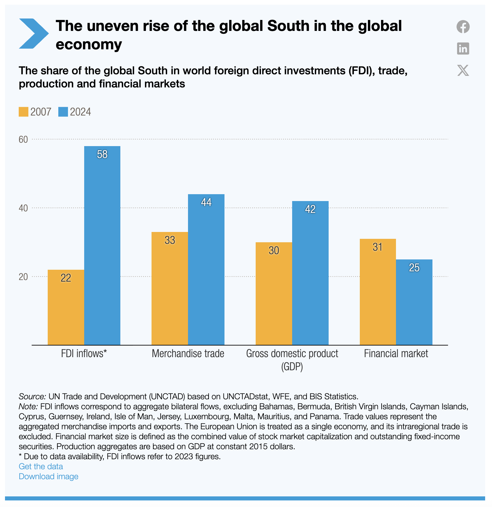 Developing economies are forecast to grow by 4.3%, faster than advanced economies. The global South now generates more than 40% of world output, nearly half of global merchandise trade and more than half of global investment inflows.